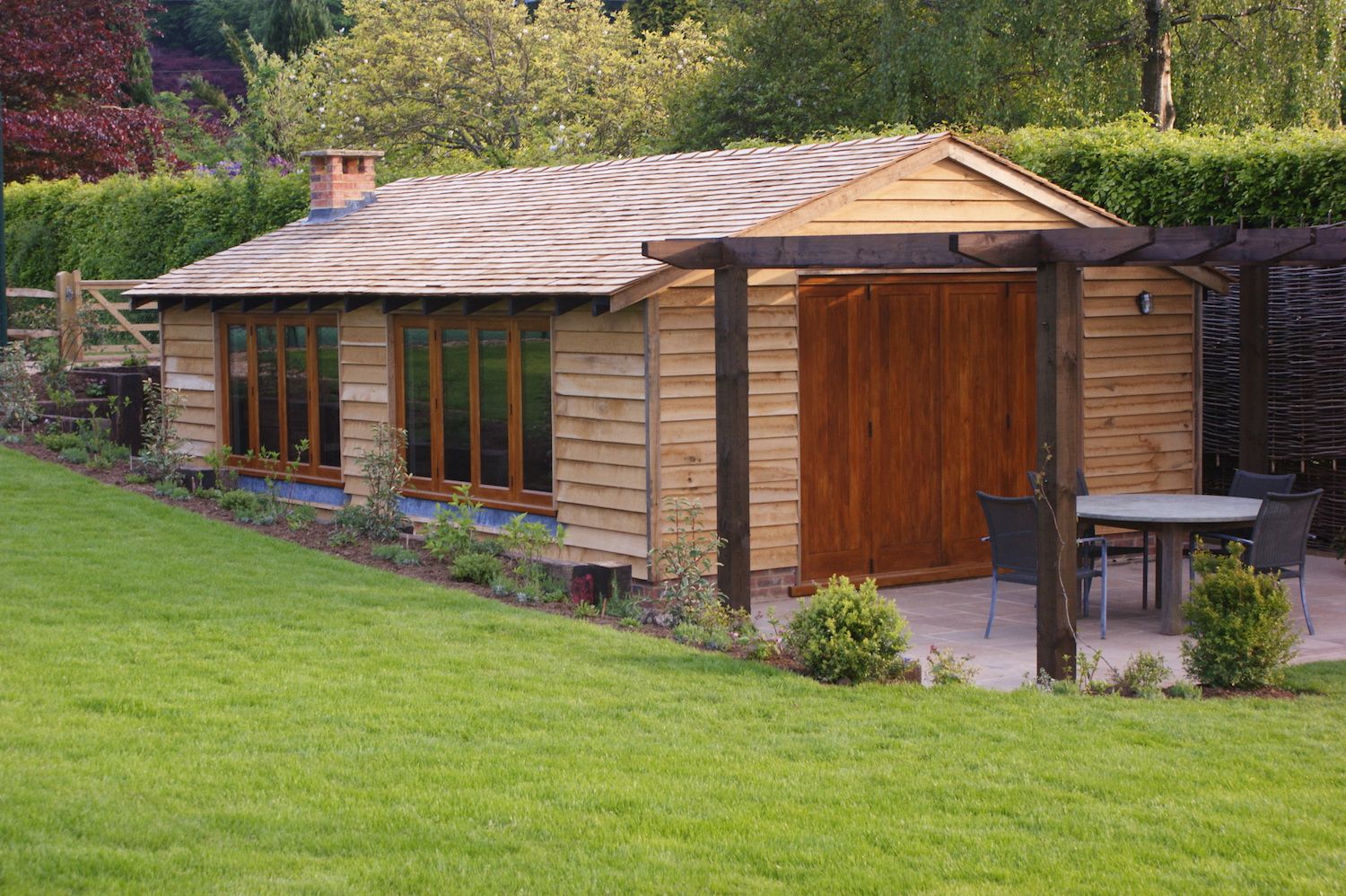 Our brief from our client was to create a really special garden/outdoor entertaining space, the creativity and overall design was very much left to us. A full open chimney breast was constructed internally along with a cloakroom and fully functioning fitted kitchen. The internal walls where finished with stained and colour washed cladding.