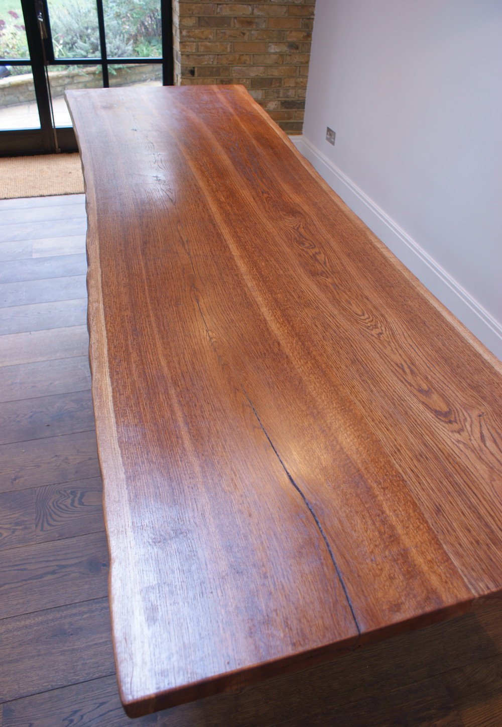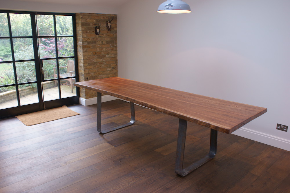 We were recently commissioned to construct a very large oak slab dining table to compliment the new extension that we had built. The table was approximately three metres long and 90cm wide, constructed in European oak with un-finished steel legs.